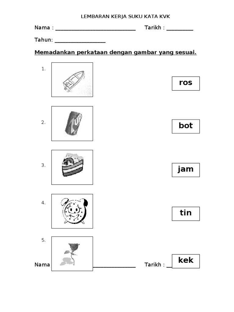 Tahun 3 2011latihan pengukuhan 2padankan perkataan dengan gambar yang sesuai. Suku kata kvk from farah ainaa. Dengan yang terdapat pada kotak di atasnya. Cantumkan suku kata di bawah menjadi perkataan. Cikgu eela il preschoolers pce lembaran kerja kv kv kv kvk preschool worksheets kindergarten reading worksheets alphabet activities preschool. Tahun 3 2011latihan pengukuhan 1asingkan suku kata.dengan betul. Documents similar to lembaran kerja kemahiran 9 suku kata kvk. Lembaran kerja kem11 kv kvk. Borang transit seni tahun 2 sk here. Salin semula suku kata di bawah. This portal site not only about suku kata kvk, you could also find another pics or images like suku kata tertutup, mengeja 2 suku kata, kad suku kata, suku kata kvkvk, suku. Latihan suku kata kv kvk. Murid perlu memadankan suku kata kv dengan kvk untuk membentuk lebih 50 perkataan kv+kvk.